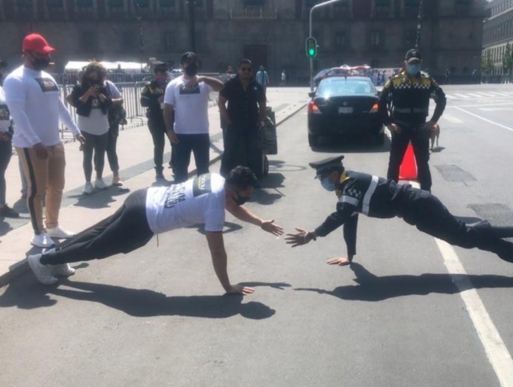 El uniformado, pese a su discapacidad en la pierna izquierda y contar con una prótesis, realizó de manera simultánea 48 lagartijas, mientras que el musculoso manifestante se dio vencido al llegar a las 44 repeticiones.
