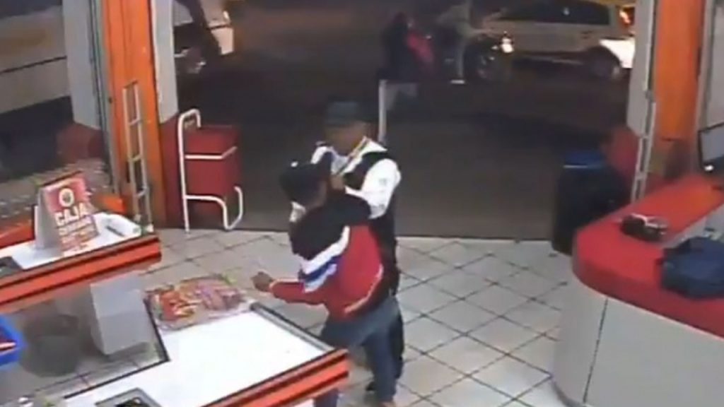 En la grabación, de casi minuto y medio de duración, se observa el momento en el que un policía sujeta y encañona a un presunto asaltante, quien intenta huir del lugar, pero al no lograrlo, recibe ayuda de dos cómplices: uno llega de la calle y otro del interior del comercio.