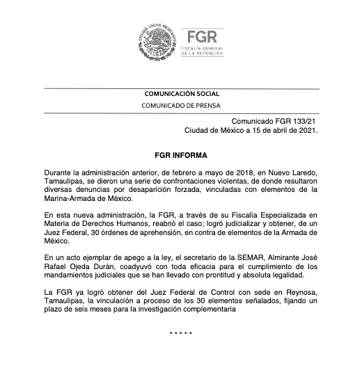 La Fiscalía General de la República apuntó que entre febrero y mayo de 2018 en Nuevo Laredo se dieron una serie de confrontaciones violentas, de donde resultaron diversas denuncias por desaparición forzada, vinculadas con elementos de la Marina.