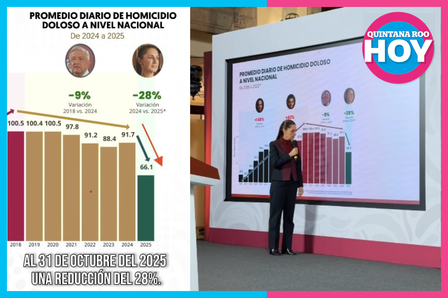 Ciudad de México.- En el Salón Tesorería, la presidenta Claudia Sheinbaum llegó con el gesto firme y la voz medida. Era, a todas luces, una mañanera para presumir resultados. Las gráficas detrás de ella mostraban una curva descendente: los homicidios dolosos bajaron 37% en los primeros 13 meses de su gobierno. “Pasamos de 86.9 asesinatos diarios en septiembre de 2024 a 54.5 en octubre de 2025”, subrayó con énfasis, marcando cada cifra como un logro colectivo.