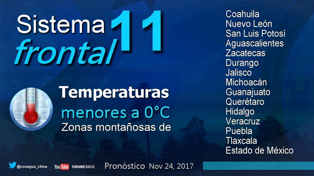 Los efectos mencionados son ocasionados por el Frente Frío Número 11 y por la masa de aire que lo impulsa.