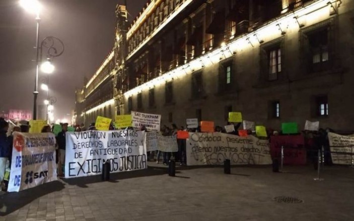 Ciudad de México.- El día de hoy un grupo de ex trabajadores del Servicio de Administración Tributaria (SAT) protestan frente a Palacio Nacional, en la colonia Centro, alcaldía Cuauhtémoc, en contra de los despidos en la dependencia.