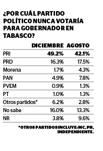 Una de las preguntas que Berumen realizadas en este estudio sobre preferencias electorales fue: ¿Por cuál partido político nunca votaría para Gobernador en Tabasco?, y como ha sido una constante en las últimas encuesta, es el PRI el instituto político más repudiado con un 49.2 por ciento; le sigue el PRD con un 16.3 por ciento; el PAN con un 4.9 por ciento y el mejor calificado es Morena con un 1.7 por ciento. Un 16 por ciento respondió que no sabe.