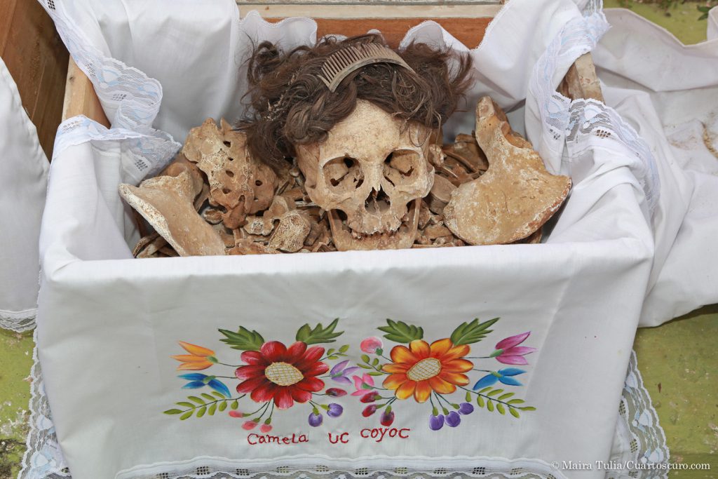 La limpieza la realizan con una brocha. Una vez limpios los huesos se acomodan de nuevo en sus cajas con su nueva vestimenta: paños de tela blanca bordados con el nombre del fallecido y flores de colores.