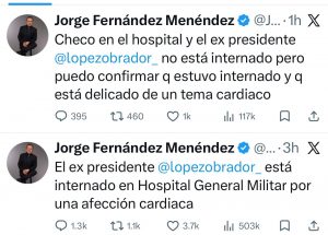 A través de redes sociales, Fernández Menéndez señaló inicialmente que el ex mandatario se encontraba hospitalizado por una afección cardiaca.
