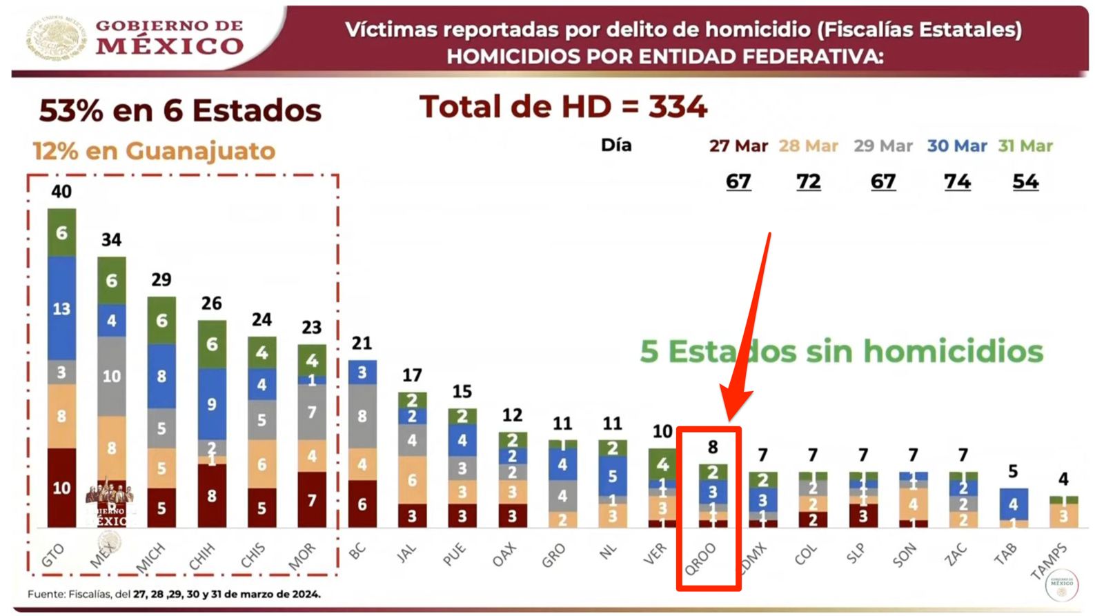 A través de una gráfica el mandatario ubicó a Quintana Roo en el Top 10 de estados con menos homicidios dolosos en Semana Santa, registrando solo 8 casos del 27 al 31 de marzo.
