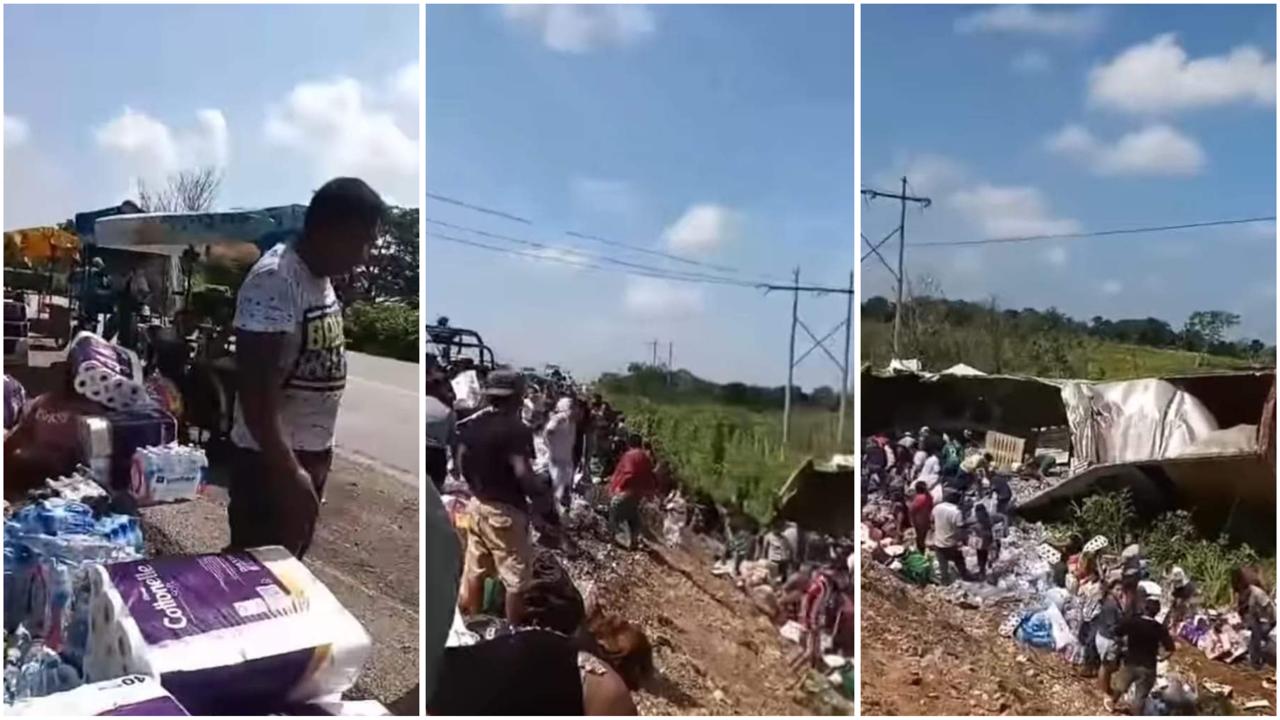 El impacto y la carga pesada causaron que la caja del tráiler se destruyera, esparciendo la mercancía por el lugar. En cuestión de minutos, tanto transeúntes como residentes de Tekit llegaron al sitio del accidente. Aprovechando la situación, comenzaron a recoger los productos esparcidos, utilizando desde moto-taxis y motos hasta automóviles y triciclos, e incluso se vio a algunas personas recogiendo los productos “a pie”.