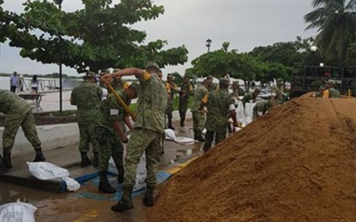 Se está aplicando el Plan DN-III-E, los soldados están realizando un muro de contención con costales llenos de arena para reducir el acceso del caudal en la cabecera municipal.
