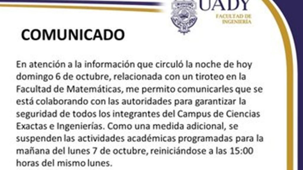 “En atención la información que circuló la noche de este domingo 6 de octubre, relacionada con un tiroteo en la Facultad de Matemáticas, les comunicamos que ya se está colaborando con las autoridades para garantizar la seguridad de todos los integrantes del campus de Ciencias Exactas e Ingeniería”, indicó la institución.