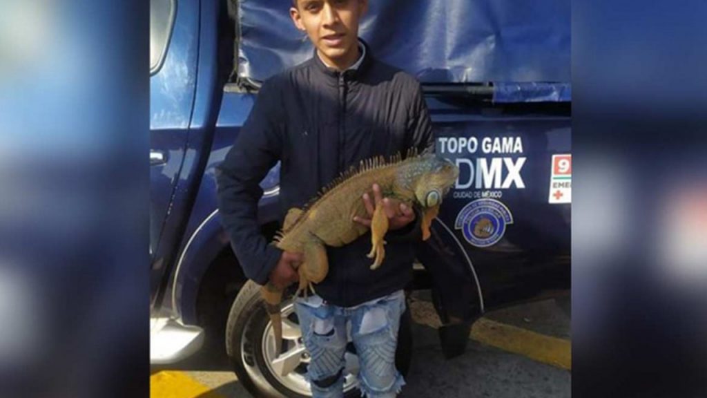 Un joven de 18 años de edad fue detenido por elementos de la Policía Auxiliar luego de ser visto cuando manipulaba a una iguana en el Eje 1 Poniente, esquina Eje 3 Sur Baja California, colonia Roma Norte, alcaldía Cuauhtémoc.