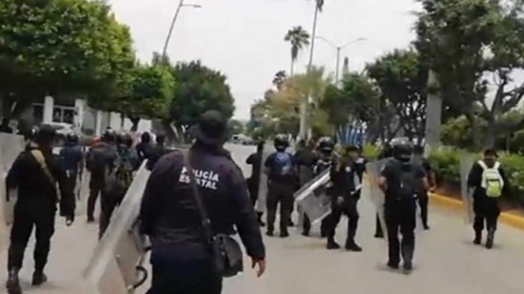 Maestros de la Coordinadora Nacional de Trabajadores de la Educación (CNTE) se enfrentaron contra policías antimotines al intentar boicotear la cadena de cambios que por segundo día realizó la Secretaría de Educación.