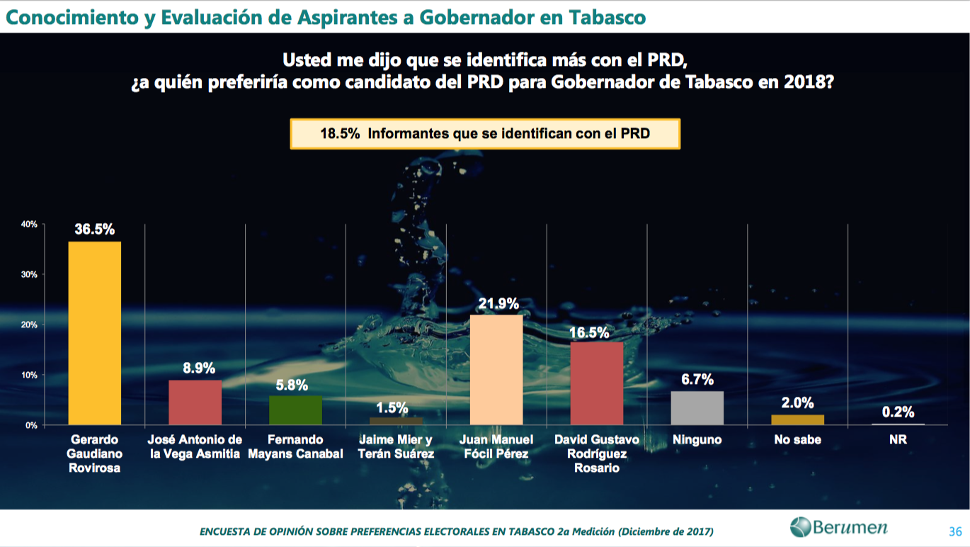 La encuesta realizada por la empresa contratada por el PRD confirmó los resultados que Grupo Cantón publicó el 15 de diciembre de este año, en donde Gerardo Gaudiano Rovirosa encabezaba con un 36.5 por ciento las preferencias electorales.