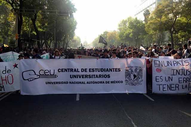 Estudiantes y miembros de sindicatos y organizaciones sociales que se aglutinaron en las escalinatas del Ángel de la Independencia marchan al Zócalo para protestar contra el incremento al precio de las gasolinas.