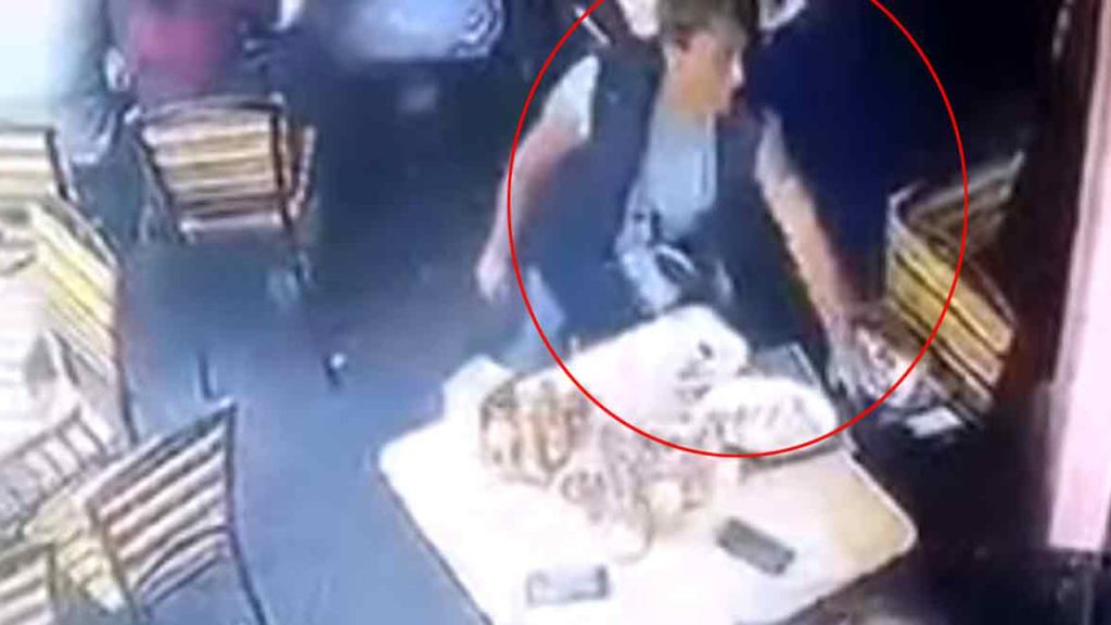 En cuando la mujer observa que las dos víctimas se encuentran volteadas recogiendo monedas, aprovecha para tomar la bolsa que está en uno de los asientos y escapa, atropellando a su paso a otros comensales.