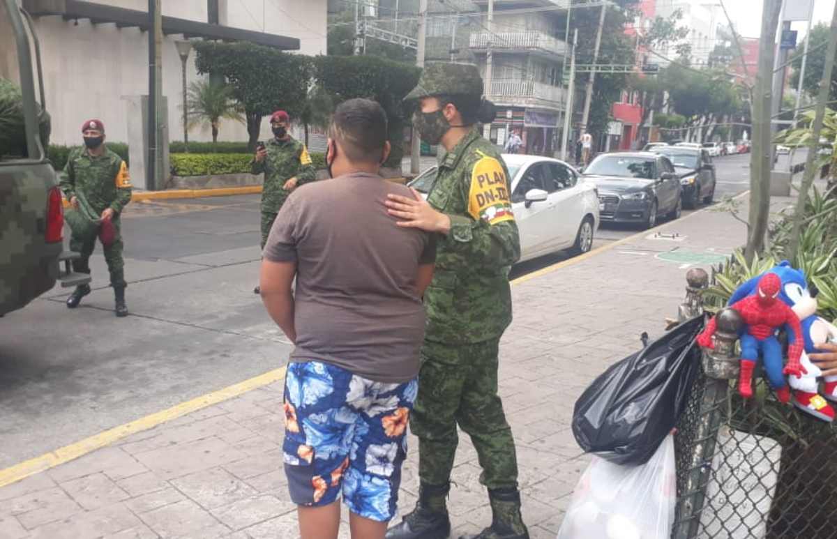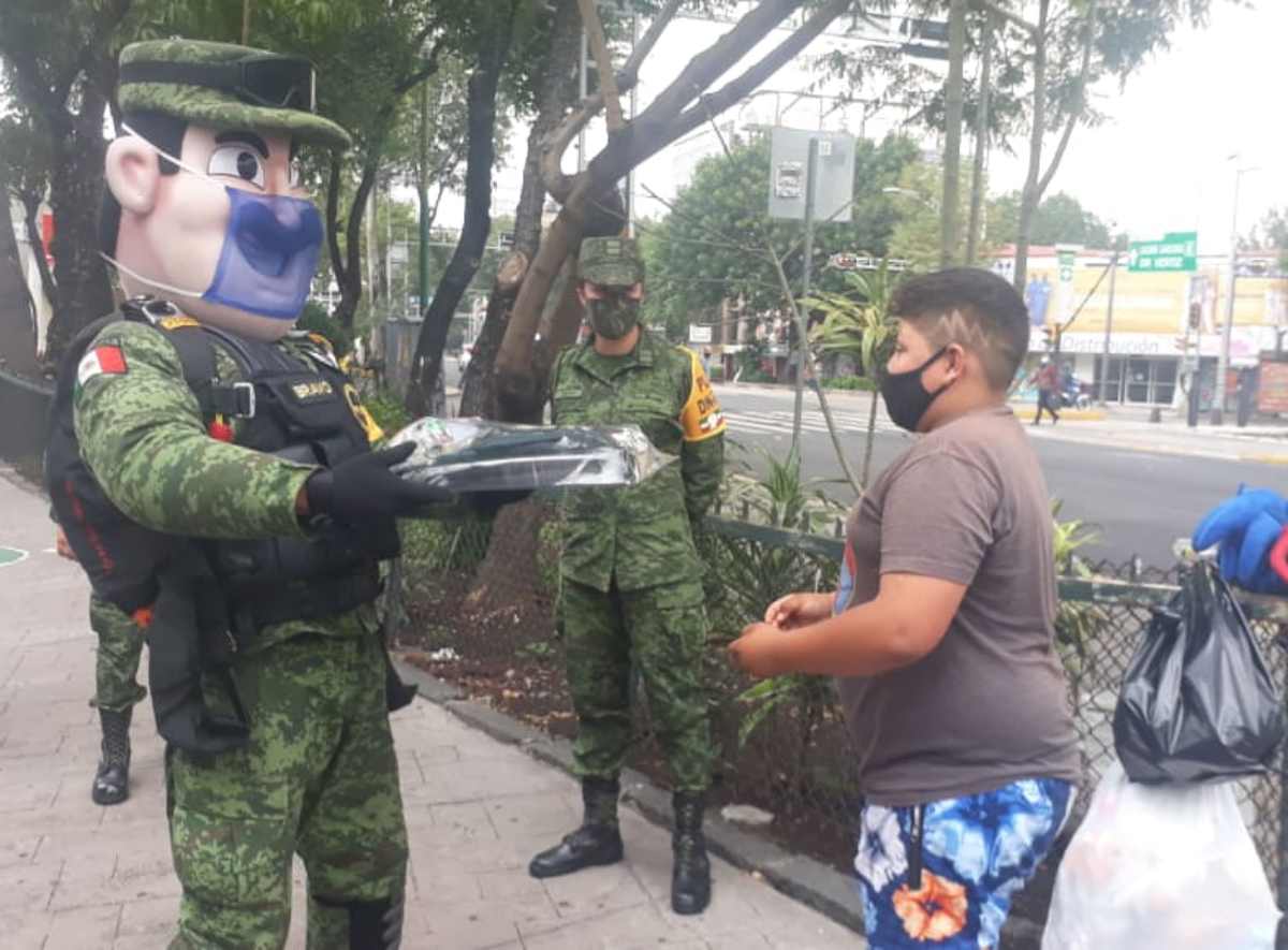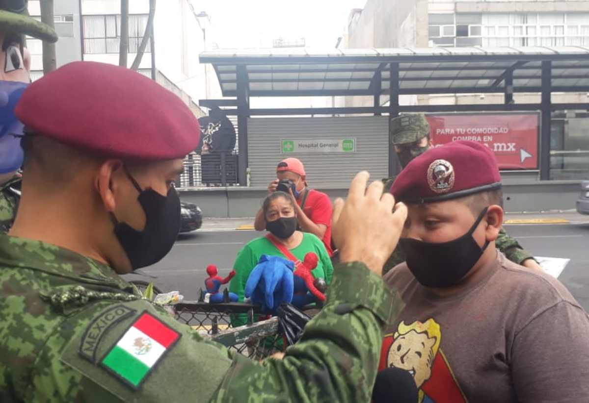 Al lugar llegó el “Soldado Bravo”, la botarga de la Secretaría de la Defensa Nacional (Sedena) con un presente en las manos, lo que provocó que Luis Ángel se incorporara de inmediato.