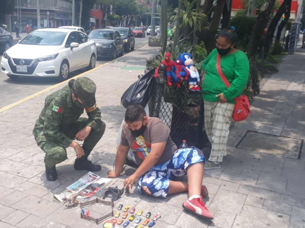 – “Que quiero ser militar”, comentó Luis Ángel, sentado en el camellón, junto a su juguetes y libros que pone la venta.