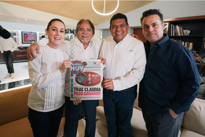 Además del material audiovisual que agradecía a Tabasco HOY por parte de AMLO, Claudia Sheinbaum revisó varios ejemplares que narran la lucha democrática de López Obrador, incluyendo el periódico de su visita hace dos años y los más recientes. “Con May cumpliré a Tabasco”, encabezaba el ejemplar del día, destacando el enfoque periodístico del primer día de su gira en Tabasco.