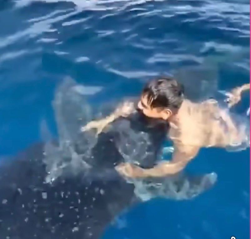 La interacción llamó la atención por la cercanía entre humanos y una de las especies más grandes del océano, reconocida por su comportamiento dócil.