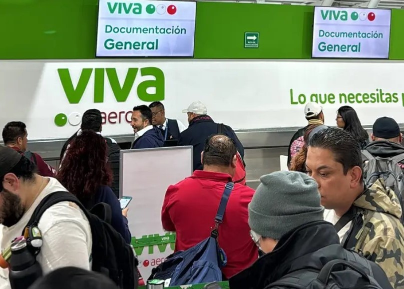 Los usuarios de Viva Aerobus afectados se mantienen en el slot de la aerolínea en el Aeropuerto Internacional Benito Juárez, en la Ciudad de México, en espera de una respuesta por parte de la línea aérea respecto a sus vuelos y a qué hora podrán despegar para llegar a su destino.