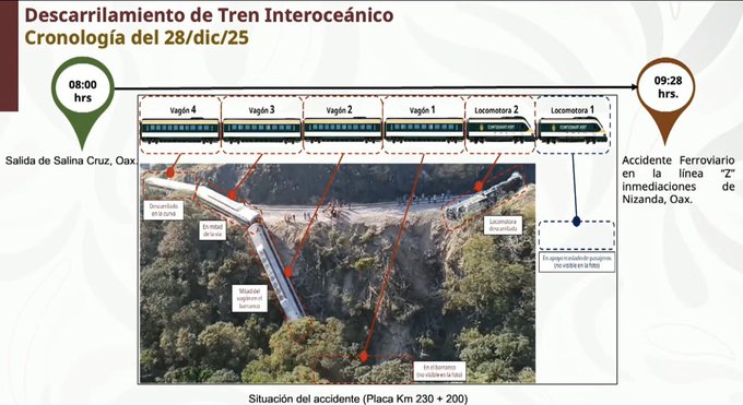 Asimismo, confirmó que el caso es investigado por la Fiscalía General de la República (FGR), en coordinación con la Fiscalía del estado de Oaxaca. Este lunes, en conjunto con la Secretaría de Infraestructura, Comunicaciones y Transportes y la Agencia Reguladora del Transporte Ferroviario, se llevará a cabo la evaluación técnica de los hechos.
