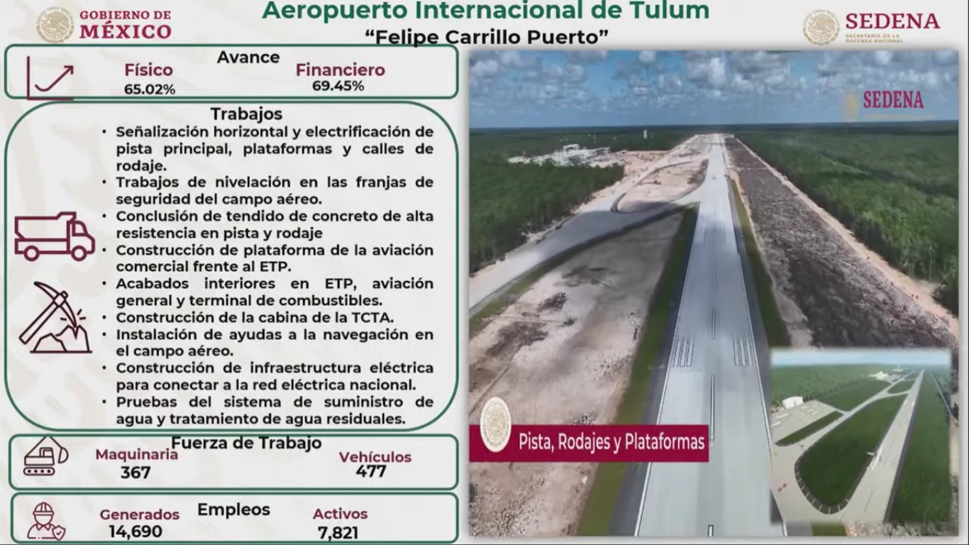 En cuanto al Aeropuerto Internacional de Tulum, el vídeo de la Sedena detalló que lleva un avance físico de 65.02%, hasta la fecha.