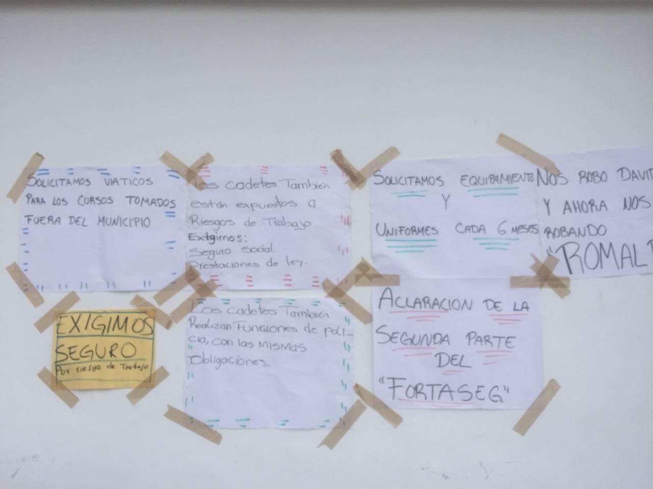 Desde temprana hora, los uniformados se plantaron en el Palacio, solicitando el pago de un bono quinquenal (que se otorga a los elementos que cumplen cinco años en la corporación), seguro de vida, afiliación al Instituto Mexicano del Seguro Social (IMSS), uniformes y condiciones más dignas de trabajo.