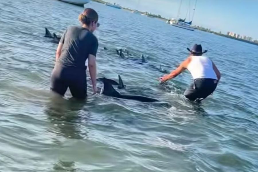 El incidente ocurrió durante el inicio de año y quedó documentado en videos que circulan en redes sociales, donde se observa a las personas empujando cuidadosamente a los delfines para orientarlos hacia el mar.