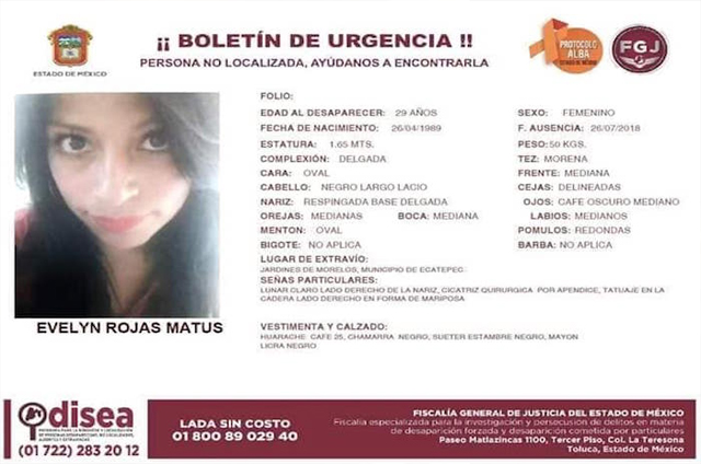 Ciudad de México.- Evelyn Rojas Matus, de 29 años, salió de su casa el 26 de julio y hasta la fecha no se sabe nada sobre su paradero. La familia asegura que el día en que desapareció, la joven fue citada por una mujer que le vendería ropa.