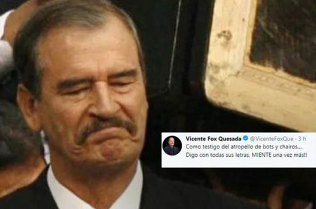 En este mismo sentido, Fox compartió en su cuenta de Twitter una nota periodística del Economista que retoma las declaraciones de AMLO, por lo que el panista aprovechó para autonombrarse testigo “del atropello de bots y chairos”, por lo que, según él, AMLO “con todas sus letras, MIENTE”.