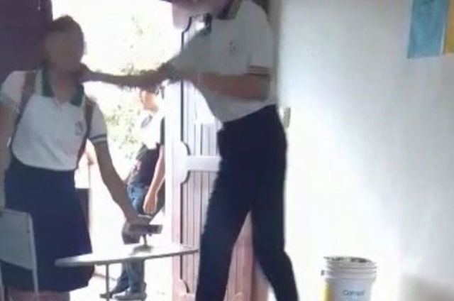 La agresión continúa por varios segundos, hasta que el joven se tira encima de la menor y continúa golpeándola, cuando otros dos estudiantes entran e intentan quitarle al agresor de encima.