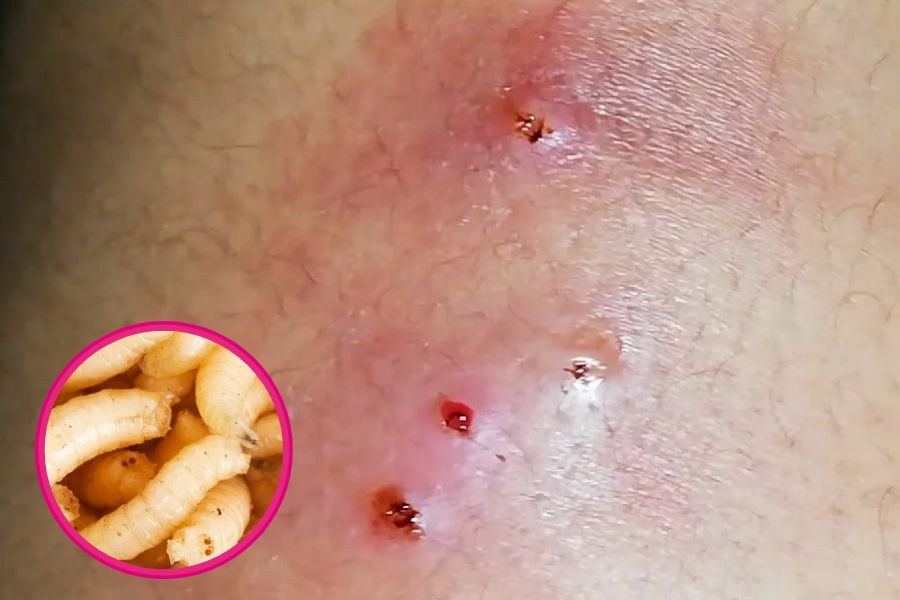 Este tipo de miasis es causada por las larvas de una mosca que deposita sus huevos en heridas abiertas, donde las larvas se alimentan del tejido vivo, generando daños severos si no se trata a tiempo.