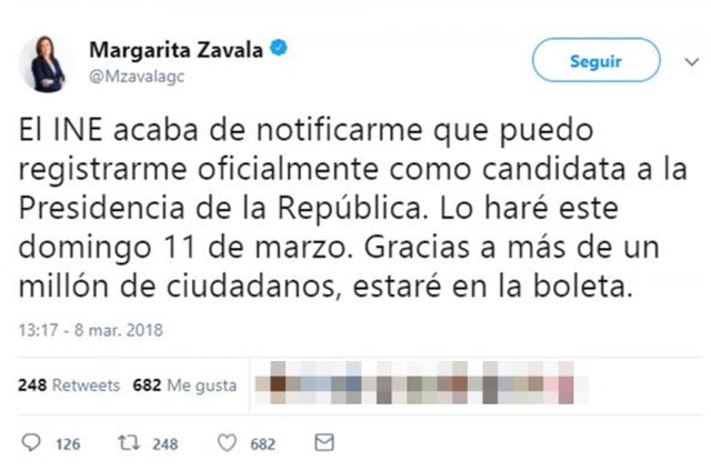 En un mensaje, a través de su cuenta en la red social de Twitter, Margarita Zavala informó que acudirá este mismo domingo 11 de marzo al INE para registrarse.