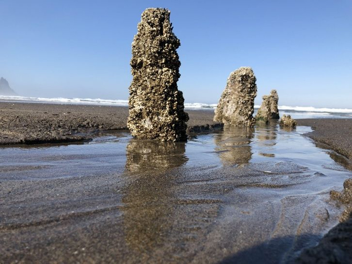 Los muñones están cubiertos de percebes, mejillones y otros moluscos. El centro de algunos troncos, particularmente grandes, se ha erosionado, creando piscinas poco profundas en las que la vida marina queda atrapada.