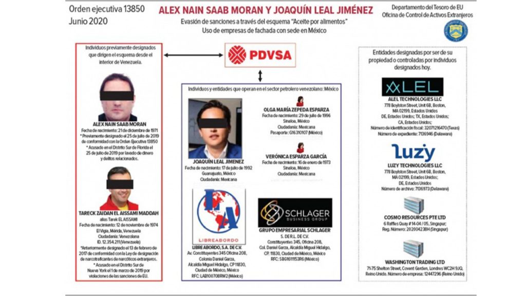 El organismo gubernamental estadunidense señaló directamente a las compañías Libre Abordo, empresa mexicana de trading especializada en intercambios de ayuda humanitaria por petróleo, y su filial Schlager Business Group, además de Olga María Zepeda Esparza, Verónica Esparza García y Joaquín Leal Jiménez, copropietarios de las mencionadas empresas, que a partir de ahora tienen prohibido hacer negocios con Estados Unidos o ciudadanos estadunidenses.