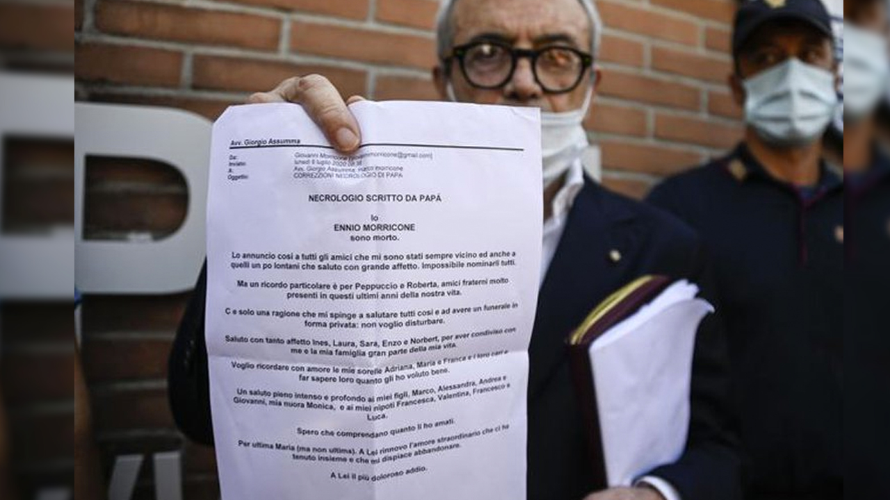 Enseguida las puertas de la clínica Campus Bio Médico de la capital se llenaron de prensa y el abogado y amigo del compositor, Giorgio Assumma, salió para leer una curiosa carta de despedida de Morricone, que será publicada mañana en los principales periódicos del país.