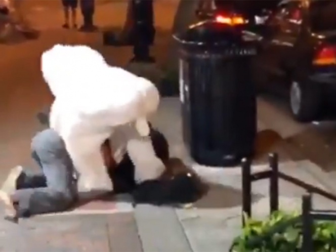 De acuerdo con testigos, el Conejo de Pascua salía de un bar y al percatarse de la agresión, no lo dudo y se fue contra el sujeto, así, entre la presunta víctima y el hombre del disfraz tundieron al hombre; hubo que llegar un elemento de seguridad para evitar más castigo.