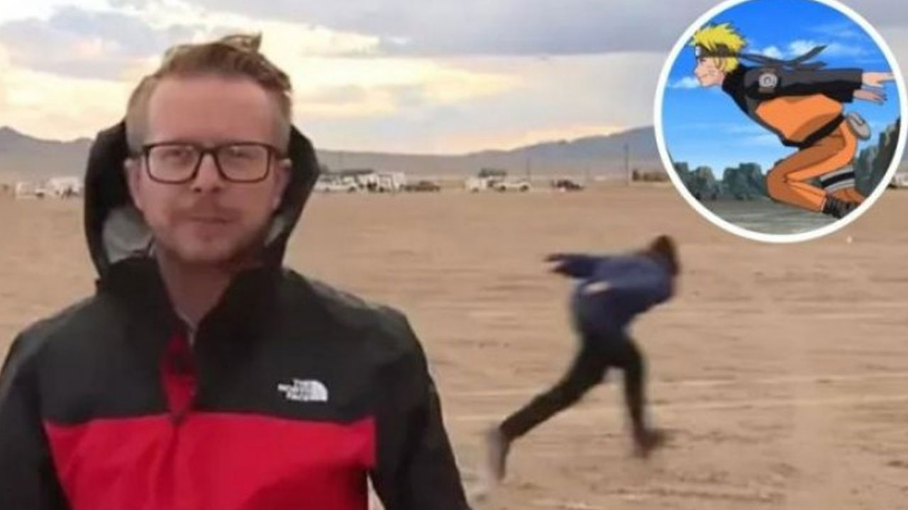 Nuevo Laredo, Tamaulipas.- Un joven se robó la atención de las cámaras ya que durante una transmisión en vivo de un noticiero americano, este sale corriendo como Naruto en la invasión al Área 51.
