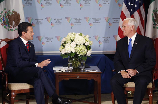 Lima, Perú— Al margen de la VIII Cumbre de las Américas en Lima, el vicepresidente de Estados Unidos, Mike Pence, y el presidente de México, Enrique Peña Nieto se reunieron en privado para discutir sobre el Tratado de Libre Comercio de América del Norte (TLCAN), pero evitaron abordar el tema del muro fronterizo.