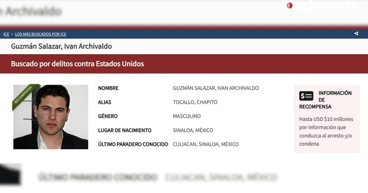 Washington, D.C., 17 de agosto de 2025.– El Servicio de Control de Inmigración y Aduanas de Estados Unidos (ICE, por sus siglas en inglés) incluyó a Iván Archivaldo Guzmán Salazar, hijo de Joaquín “El Chapo” Guzmán, en su lista de los más buscados, y ofrece hasta 10 millones de dólares por información que conduzca a su captura o condena.