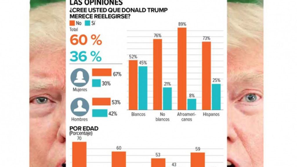 Mientras que 36 por ciento respondió que sí a la pregunta “¿Cree usted que Donald Trump merezca reelegirse o no?”