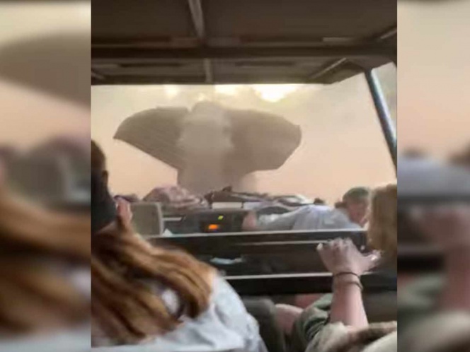 En las imágenes se observa cómo el enorme animal se topa con un jeep de frente que transportaba turistas.