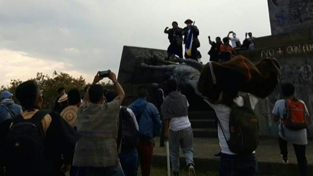 En repudio a la violencia histórica que han enfrentado desde la conquista, Indígenas colombianos derribaron ayer con múltiples cuerdas la estatua de Sebastián de Belalcázar, ubicada en Popayán.