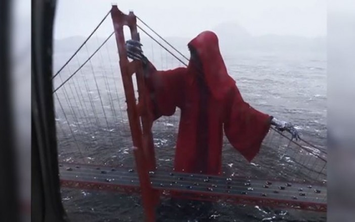 San Francisco, California, Estados Unidos.- En el video viral publicado en Reddit y en la cuenta de Instagram de un usuario llamado ‘justinleduc’ aparece junto al Golden Gate de San Francisco una figura tan grande como el puente que, vestida con una capa roja, vigila los coches que lo cruzan.