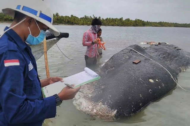 El cetáceo, de 9.5 metros de largo por 4.3 de ancho, fue encontrado el lunes por ecologistas en la isla Kapota, situada dentro del Parque Nacional de Wakatobi, en la provincia de Célebes del Sur, indicó el Ministerio de Medioambiente de Indonesia en un comunicado.