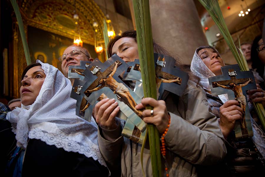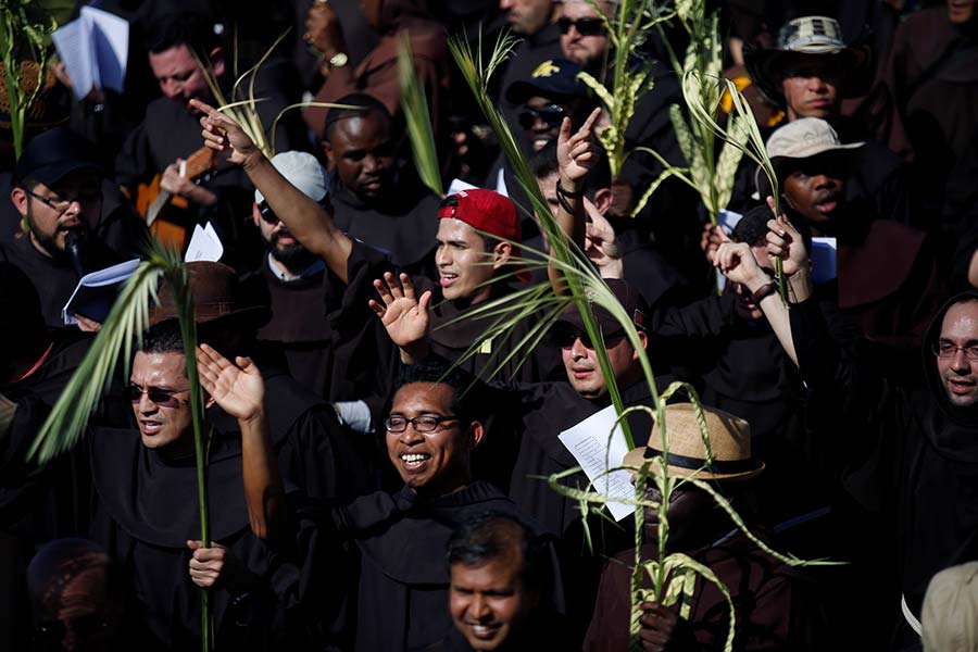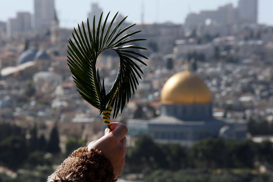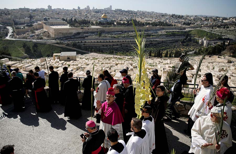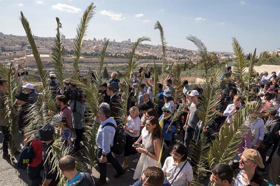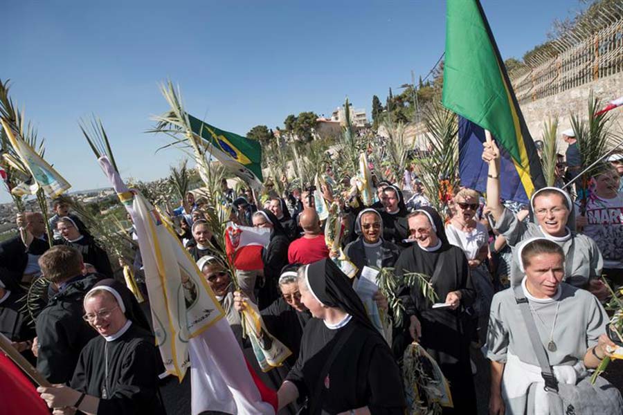 Miles de católicos celebraron hoy la tradicional procesión del Domingo de Ramos, que da comienzo a la Semana Santa, y recorrieron a pie el camino que Jesucristo hizo en burro desde el Monte de los Olivos hasta la Ciudad Vieja de Jerusalén, donde entraron alzando hojas de palma en tono festivo.
