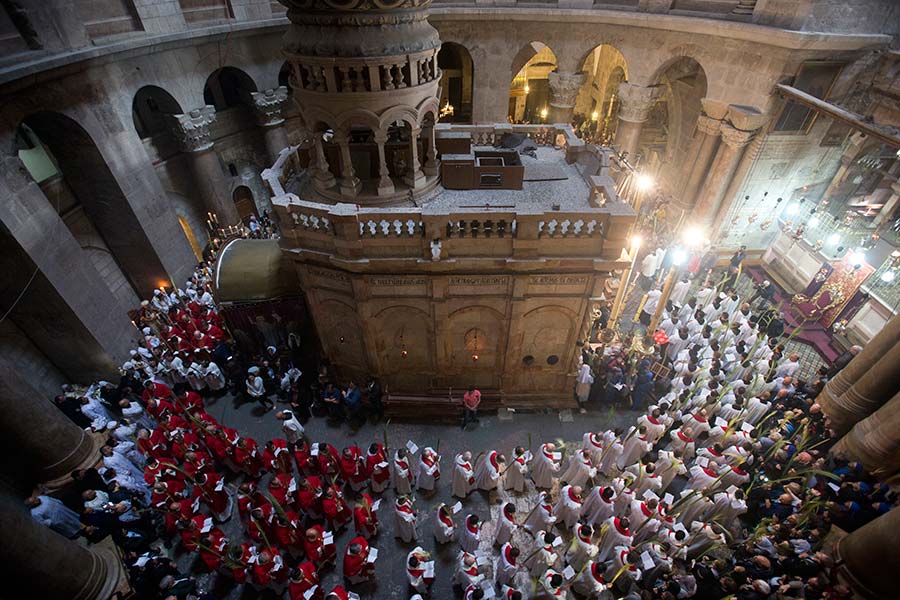 La procesión, encabezada por sacerdotes palestinos que enarbolaban una cruz hecha con hojas de palma, con dos guardias de honor a cada lado, que picaban con un bastón en el suelo, transcurrió en un ambiente profundamente festivo, con cantos de salmos en árabe, aplausos, y el sonido de los tambores que hacían retumbar los jóvenes escoltas.