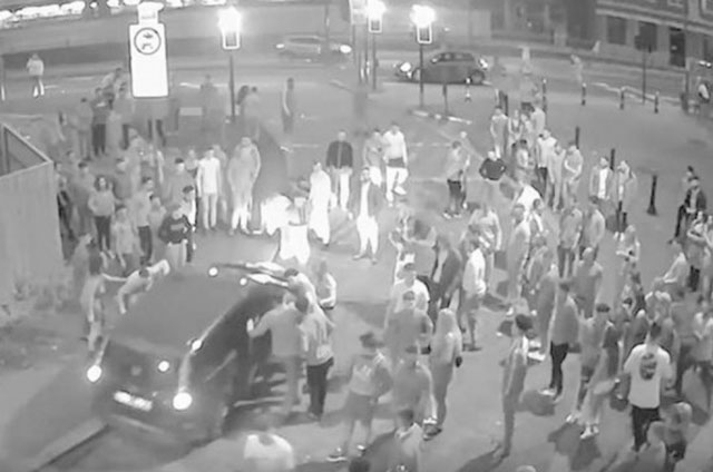 En la imagen se aprecia cómo el auto golpea a uno de los transeúntes, lo que lleva a algunos a patear el vehículo y enfrentarse a Cox. A continuación, el automóvil avanza y gira hacia la acera en dirección a un grupo de personas, incluidas las víctimas Sophie Poole y Emma Nicholls, que están sentadas en un bordillo.