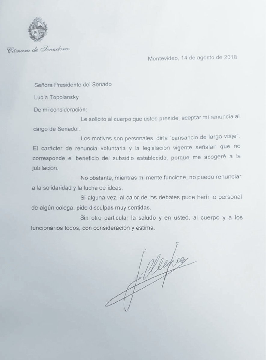 Mediante una carta que leyó su esposa, la presidenta del Senado Lucía Topolansky, Mujica aseguró que “los motivos son personales diría ‘cansancio de largo viaje’”. Por este motivo se trata de una “renuncia voluntaria” y de acuerdo a la legislación vigente “no corresponde el beneficio del subsidio establecido”.