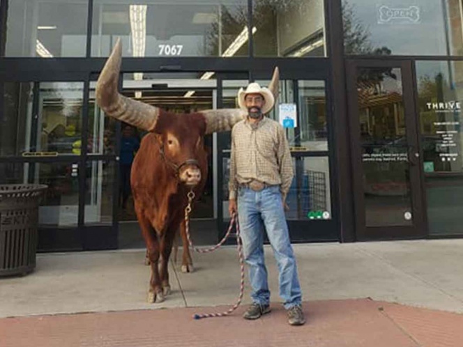 Oliver, de raza Watusi Africano, es propiedad de Browning, quien lo entrena para rodeos y otros espectáculos, y aunque no está claro exactamente cuánto pesa, los bueyes de esa raza pueden alcanzar los 700 kilos, reportan medios locales.