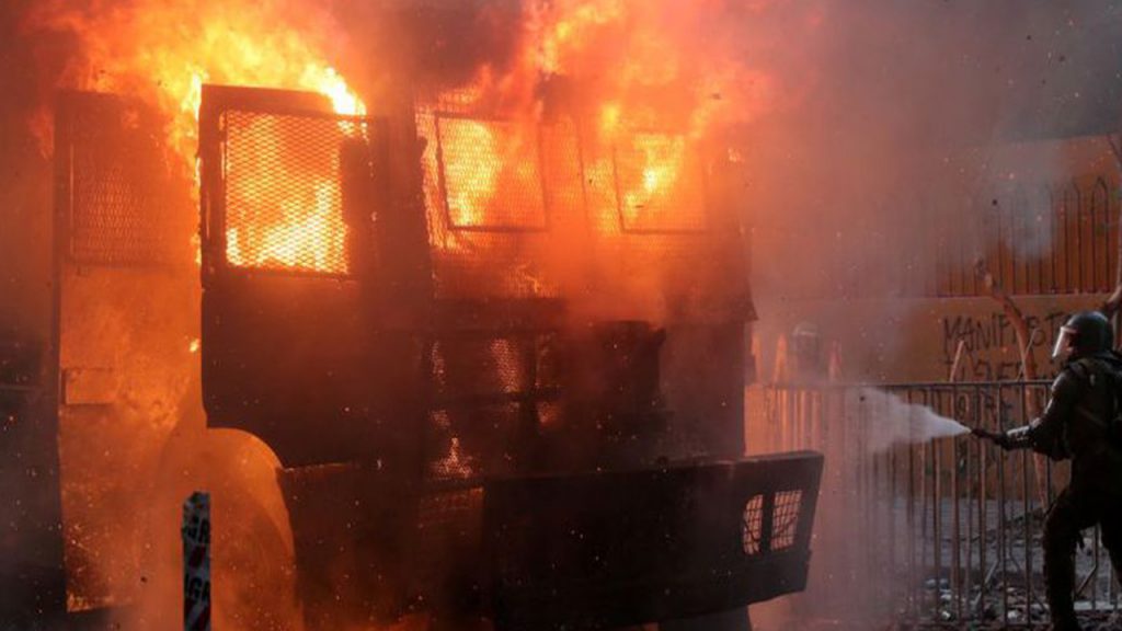 Encapuchados quemaron el viernes un vehículo lanzaaguas de la policía en el marco de las protestas que todos los viernes realizan los chilenos en demanda de justicia social, en las que semanalmente enmascarados se enfrentan con efectivos antimotines.